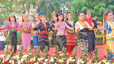 在2018老挝旅游年启动仪式上,当地演员表演民族歌舞。
