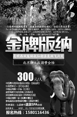 记者来到位于青年路一处老旧小区的北京金色阳光旅行社,咨询为父母报名旅行团,工作人员立即拿出手机,将其中几条线路海报电子版给记者看,其中一张是去泰国的,“现在去泰国天气暖和,老人们都喜欢。年底我们大促销,原价都是3000多,现在只要2000元。”此外,对方还拿出来一张去西双版纳的旅行宣传册,上面写着“双飞6天仅需300元”。销售人员告诉记者,这个团价格便宜十分紧俏,但是需要至少5人一同报名才能享受这个价格,但当记者提出要和老人同行后,却遭到了工作人员的拒绝。“这个团是我们专门为老人打造的,要求60岁以上的老人才能参加。”当记者询问是否有自费项目或者是否保证出团时,工作人员又顾左右而言他:“这个机会十分紧俏,您要是给老人报名要尽快。”