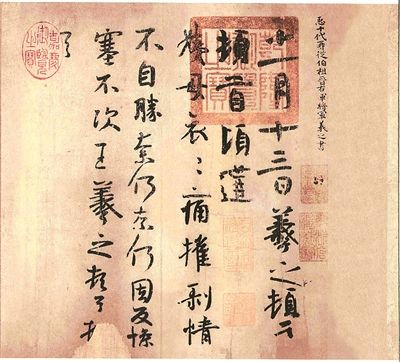 手帖大多是些不经修饰的生活事。如《平复帖》,共84字,草隶书,笔意婉转,风格质朴,叹友人彦先壮年患疾,恐难痊愈,所幸有子承伴,感慨人生无常之憾。本帖原创曾受争议,目下公认为陆机。陆机乃东吴丞相陆逊之孙,于一次兵败中,遭到小人报复,被株连三族,留下了凄惨悲壮的“华亭鹤唳,岂可复闻乎”。文与字皆能映射创作者的心声。诚如蒋勋所说:“这封手贴把死亡的沉寂与燃烧的热烫火焰一起写进了书法。”