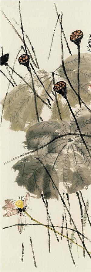 中国画家爱画荷花,远的有明末清初的八大山人和恽寿平,近代的中国画大师吴昌硕、齐白石、张大千、潘天寿、刘海粟、李苦禅、石鲁等,都是画荷花的妙手。八大山人的荷花残败荒凉,恽寿平的荷花工笔规整,吴昌硕的荷花金石味浓,齐白石的荷花豪放大气,张大千的荷花婀娜多姿,潘天寿的荷花刚健挺拔,刘海粟的荷花泼彩浓艳,李苦禅的荷花铁笔酣畅,石鲁的荷花夸张简练,每个人都对荷花有自己的刻画和解释。但若论最奔放写意,淋漓痛快,则非齐白石的荷花莫属。齐白石画的荷花也是经历了一个由简到繁的过程,晚年的荷花墨色淋漓,色彩艳丽,穿插繁密,笔势豪放,将荷花的写意描绘推高到一个新的境界。