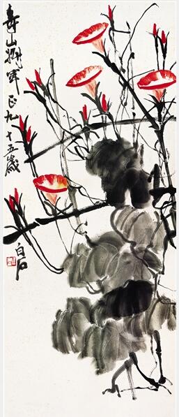 《牵牛花》是白石老人众多同类题材画作中的一幅。此画的叶子上下错落摆放,看上去变化不大,但叶脉通气,开放的花头像一个金碗仰面朝天,接纳着阳光也接纳着甘露,缠绕在花间的根茎联络着叶脉与花朵的感情,也联络着一个人的生命。我看过白石老人在处理同类题材的画作,有时将叶子画得一团黑,活像田间的卧牛,有时将叶茎摆放如花朵,花头大过叶子,花如叶密,叶如花艳,此花的下面趴着一只工细的蚂蚱,这是白石老人童真的流露。